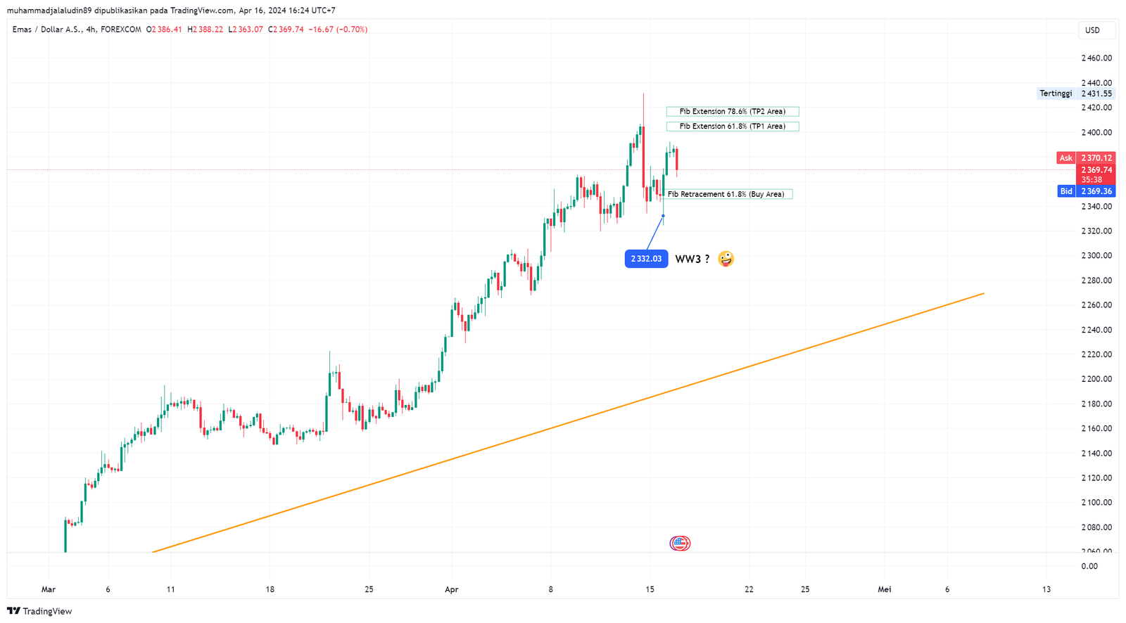 "Emas spot dapat terkoreksi ke kisaran $2.345-$2.354 per ons, karena koreksi dari level tertinggi 12 April di $2.431,29 terlihat belum selesai," kata analis Reuters, Wang Tao.